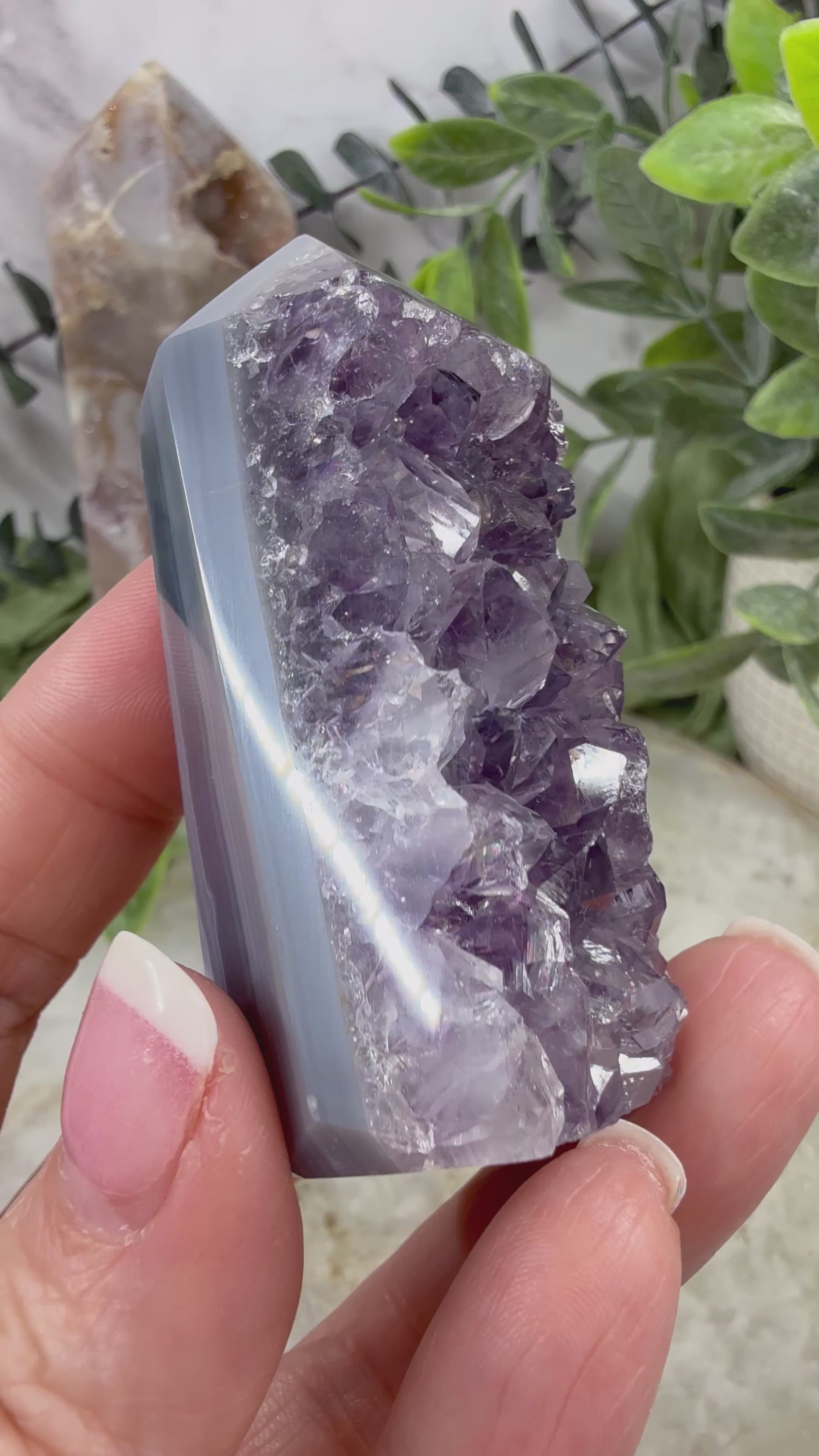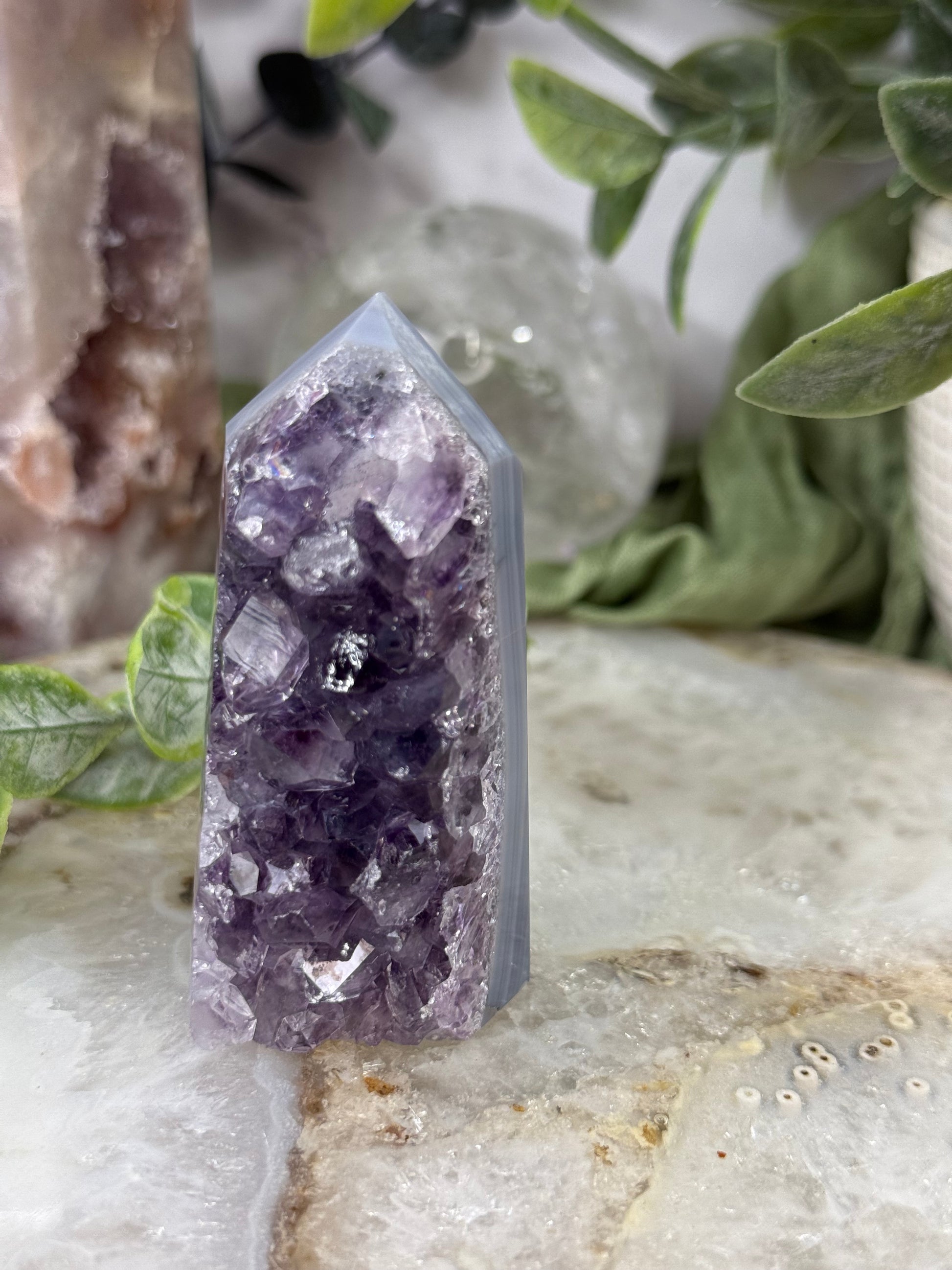 Indulge in the calming energy of our amethyst blue agate tower. The natural amethyst agate is a stunning addition to any room, and its unique shape adds a touch of elegance. Enjoy the benefits of its soothing powers, promoting relaxation and balance. Perfect for any crystal collection!