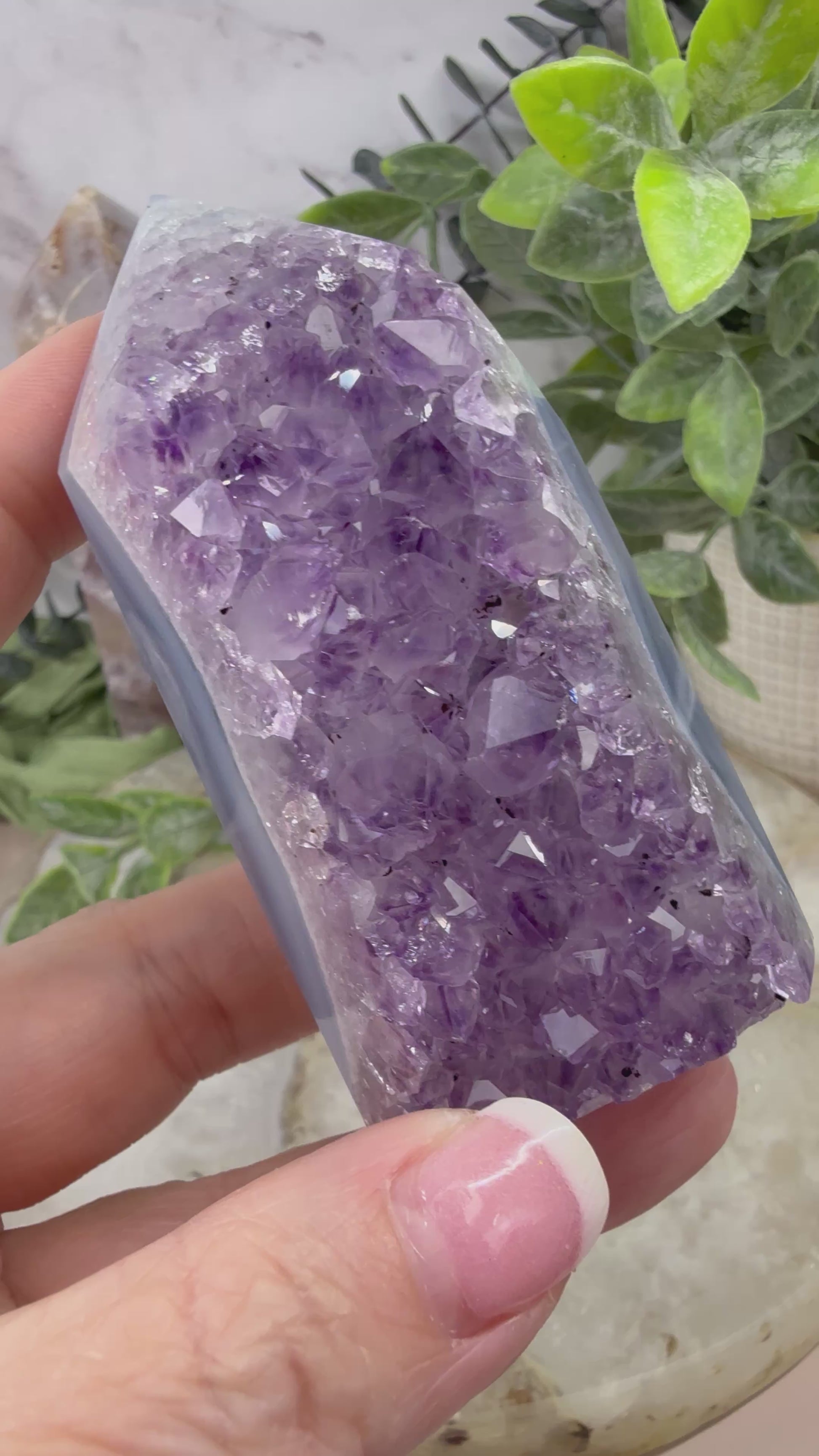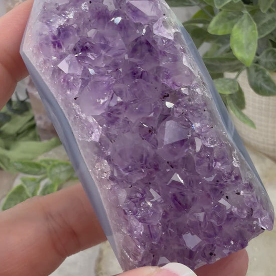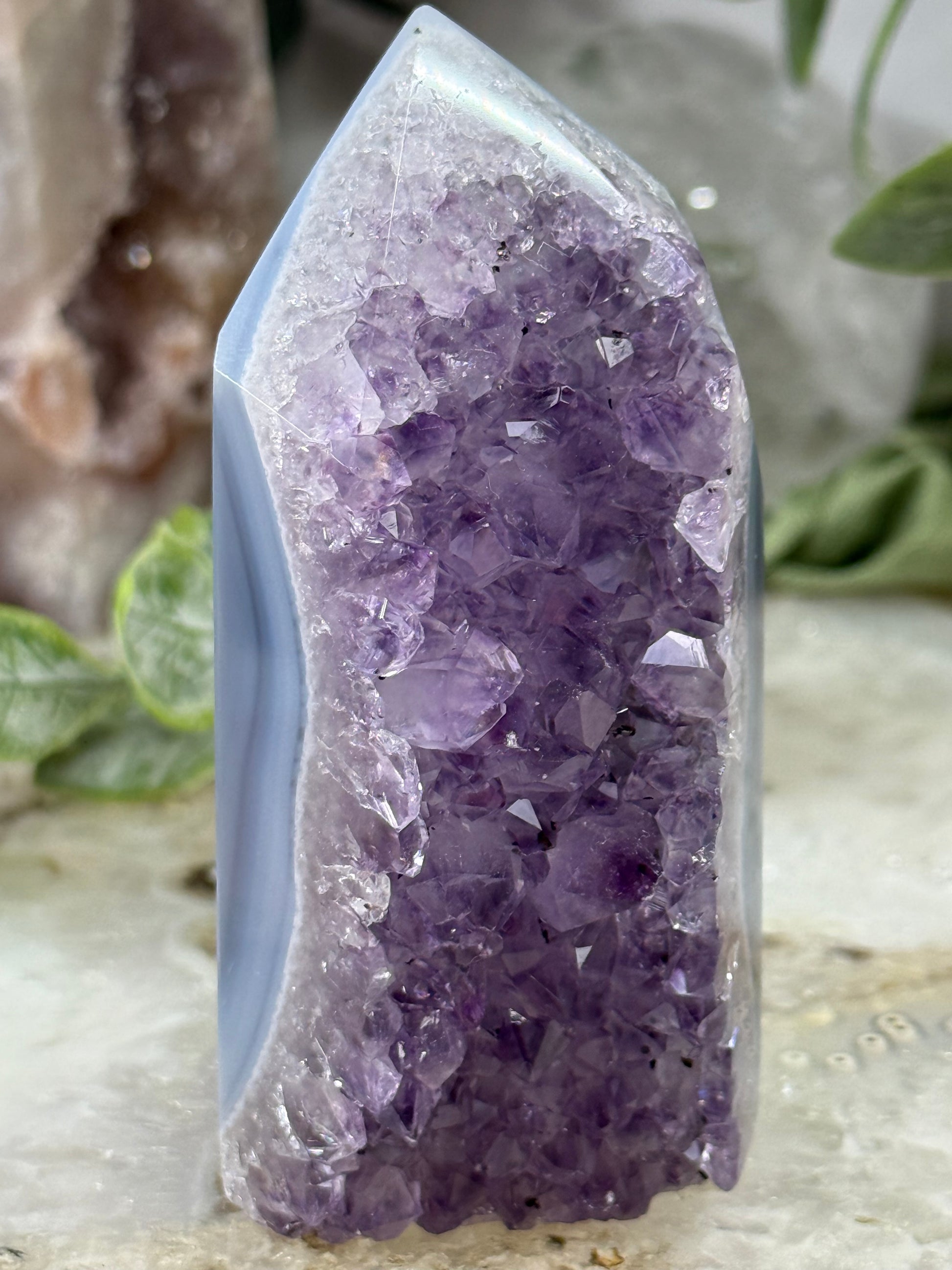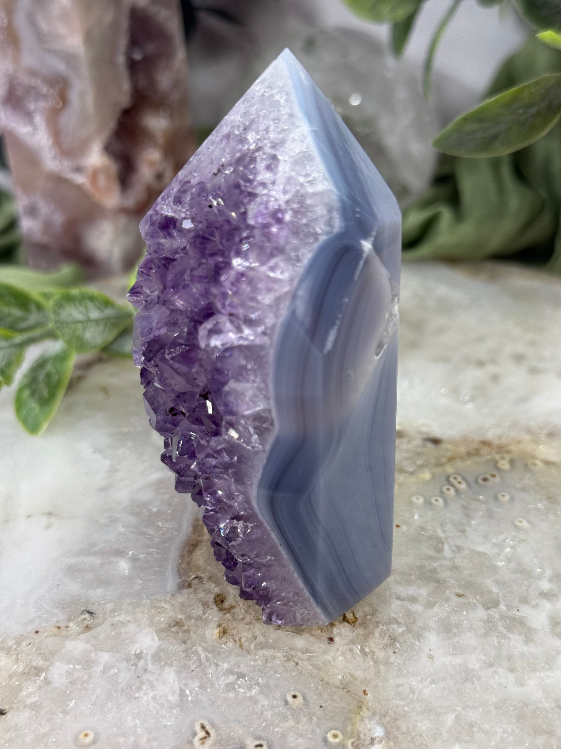 Indulge in the calming energy of our amethyst blue agate tower. The natural amethyst agate is a stunning addition to any room, and its unique shape adds a touch of elegance. Enjoy the benefits of its soothing powers, promoting relaxation and balance. Perfect for any crystal collection!