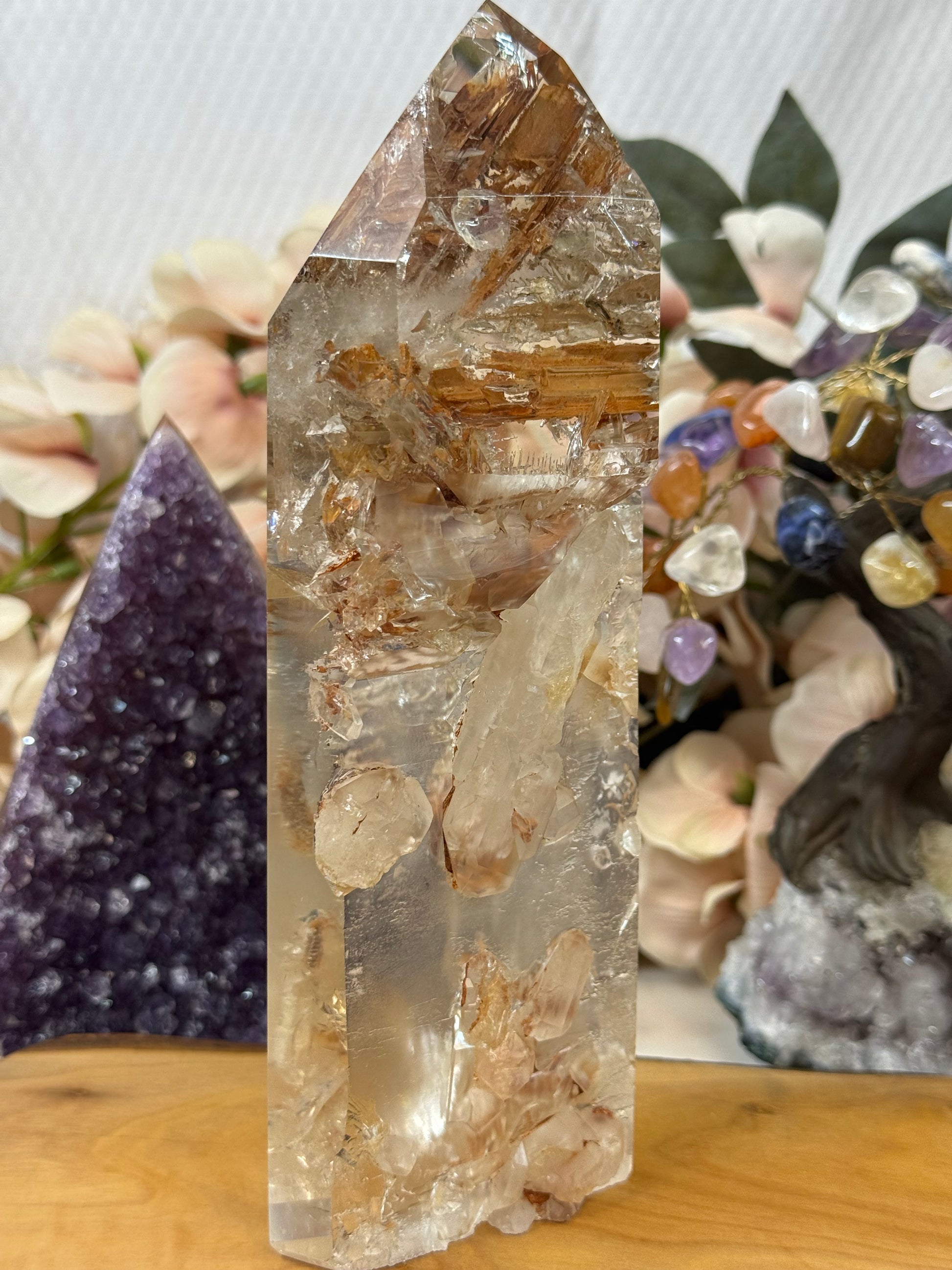 This Elestial Lodalite Quartz Tower is expertly crafted with half-polished surfaces and stunning penetraters. Delve into the depths of the garden court and unlock the healing potential of this unique crystal. With its precise form and natural beauty, this tower is a must-have for any crystal enthusiast.