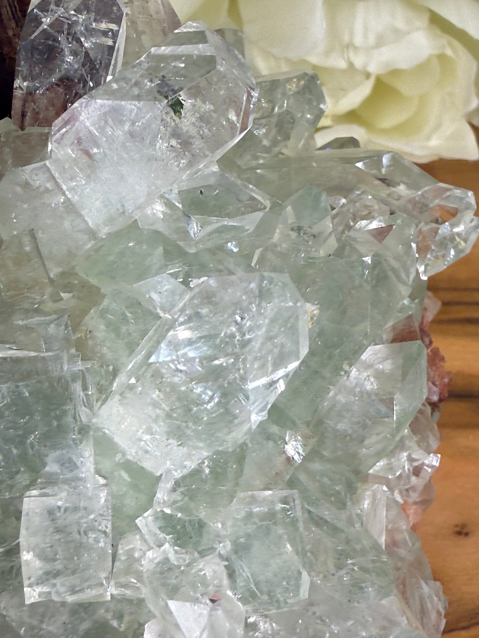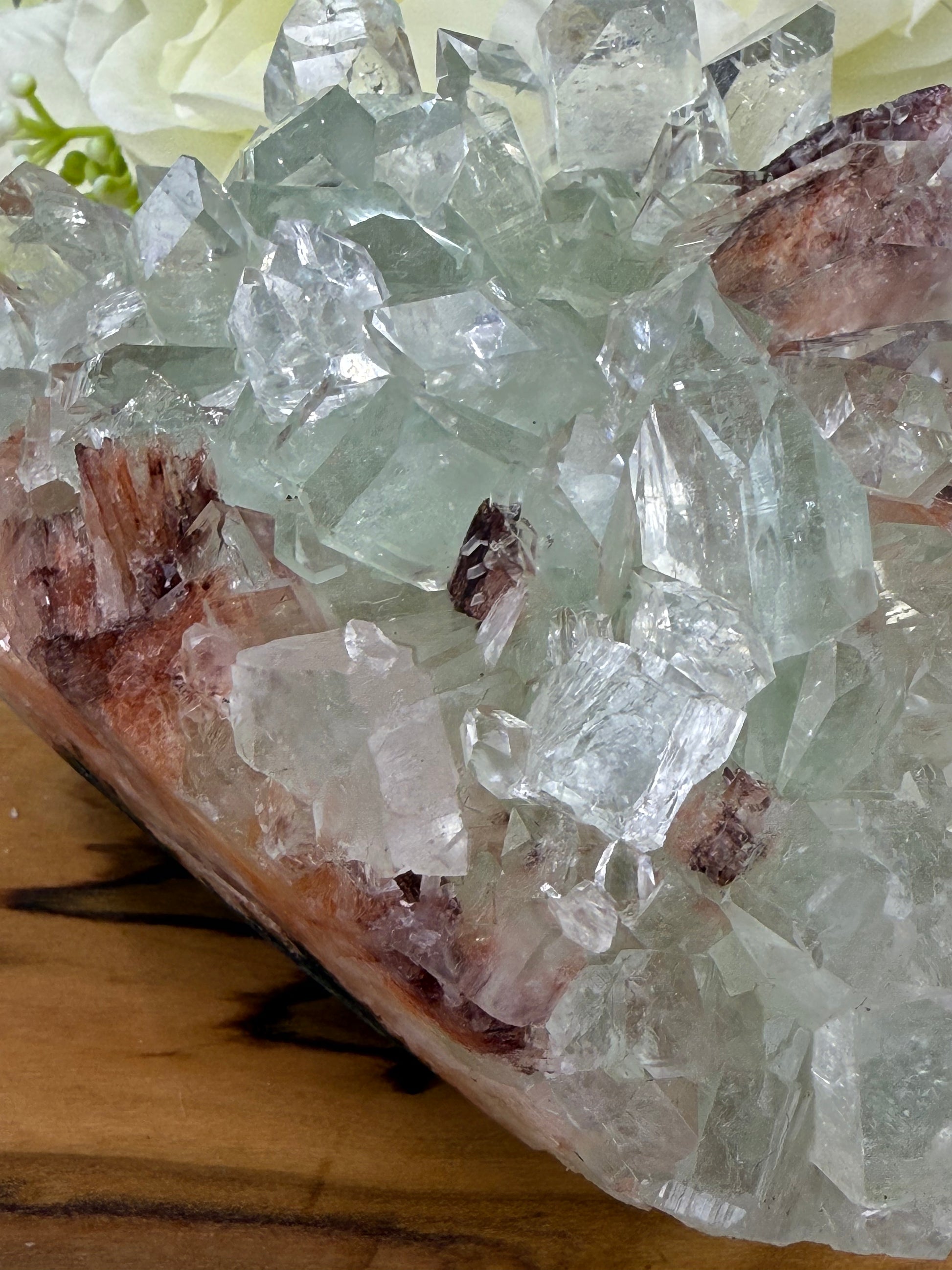 AAA mint green apophyllite with red huelandite flower formation. This is a rare piece to find and is an amazing collectors piece!