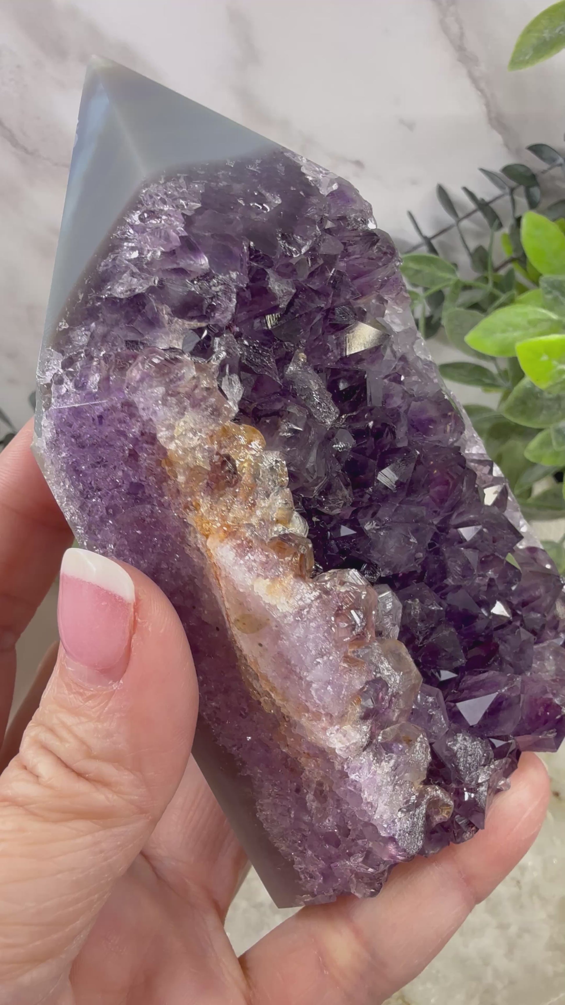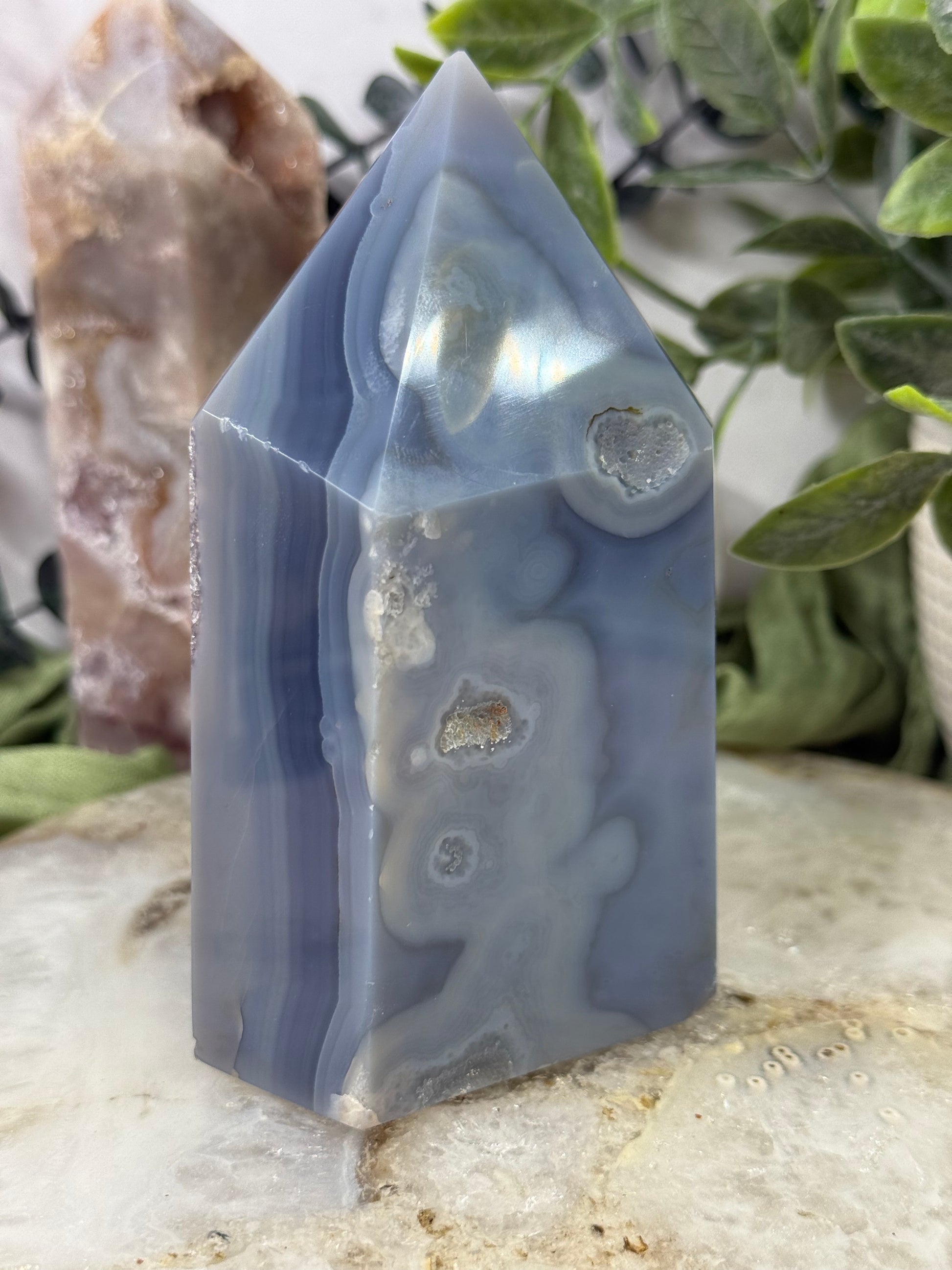 Elevate your space with our stunning Purple Amethyst Blue Agate Tower! Featuring a shimmering purple amethyst crystal atop a vibrant blue agate base, this tower will add beauty and positive energy to any room. Bring a touch of luxury and serenity to your home or office today!