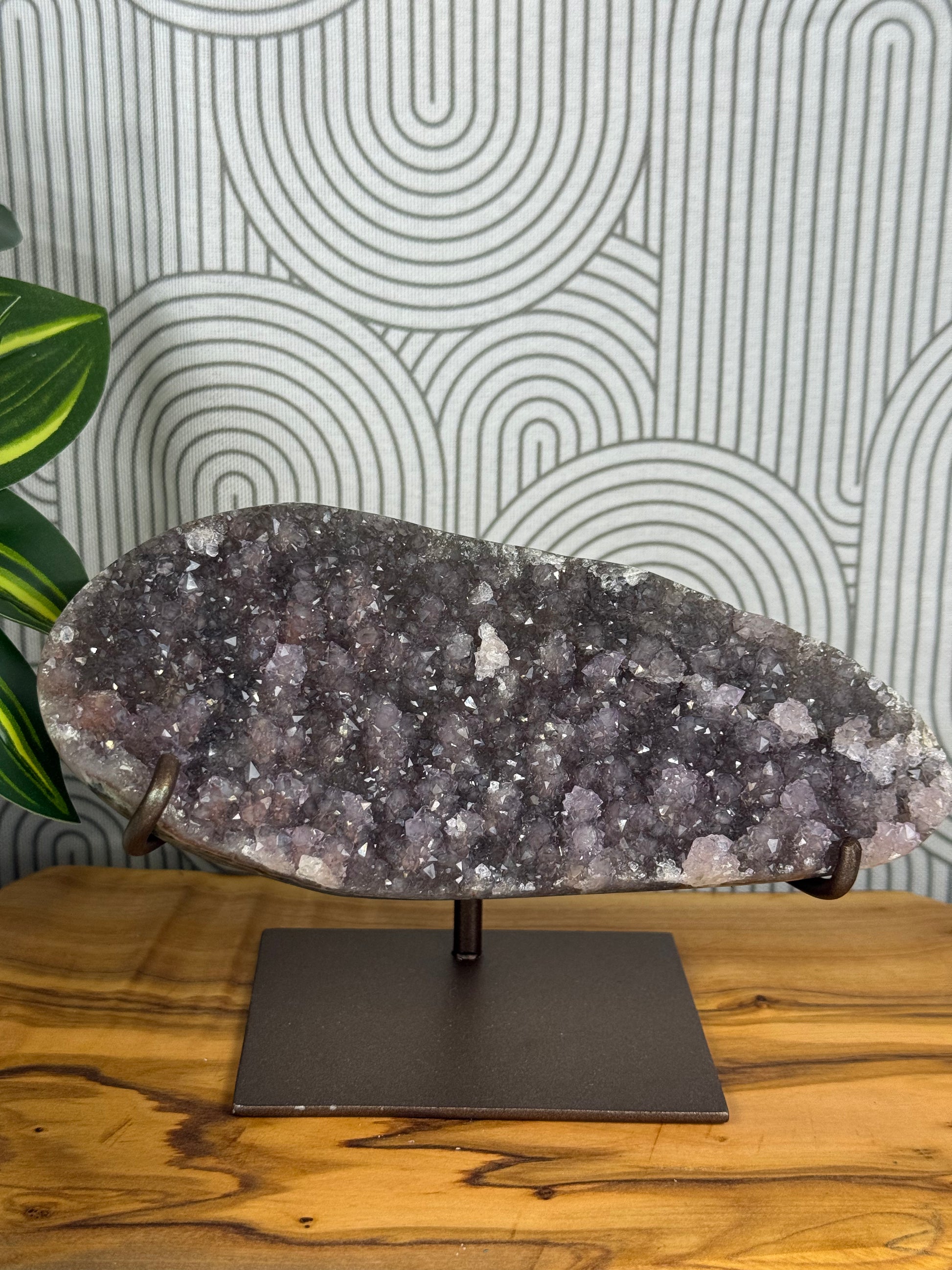 Rainbow amethyst piece with stand featuring pink, purples and reds. From Uruguay.